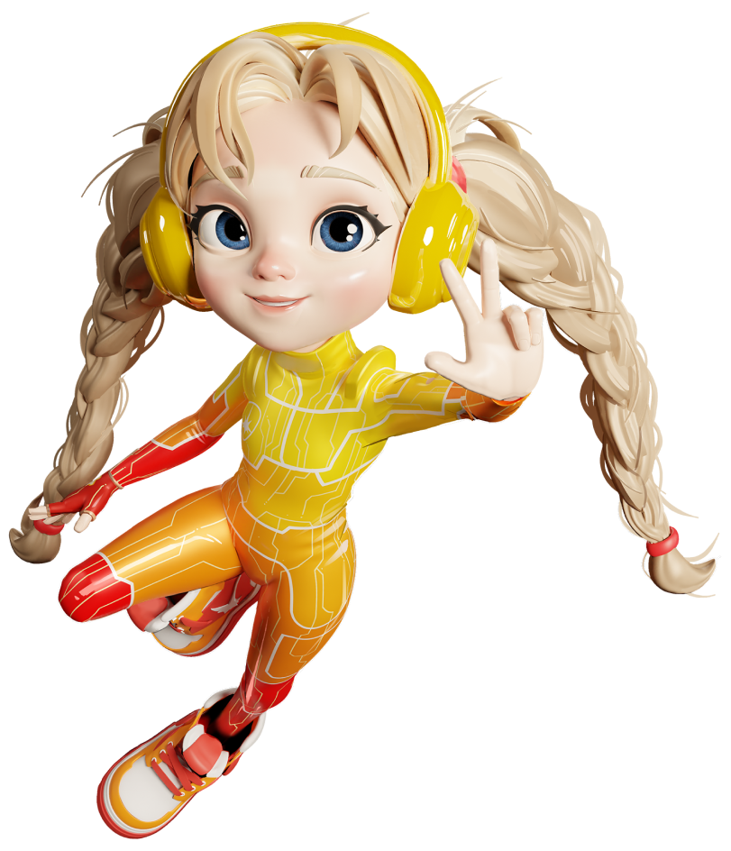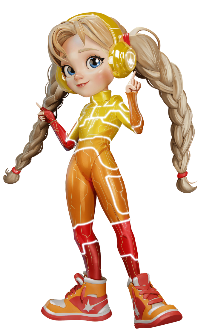 slightly younger and shorter than her fellow superheroes. She loves wearing overalls and prefers bright colors like red and orange. Her signature look includes two light braids.